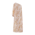 Embrace effortless elegance with this striking one-shoulder kaftan, crafted from a luxurious cotton-silk blend. The dramatic asymmetrical neckline creates an instantly chic silhouette, while the boho-inspired patchwork bandana print in warm café tones adds artistic flair. Thigh-high side slits provide movement and breathability, making it perfect for resort wear or sophisticated casual occasions. A versatile piece that transitions seamlessly from day to evening.